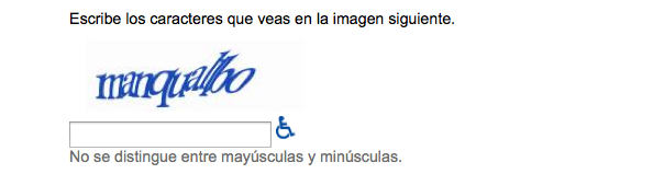 En cualquier página web podemos encontrar un CAPTCHA como el de la foto de arriba, bien sea para registrarse o para acceder a un servicio determinado. Se muestra para que lo copiemos en otro recuadro y se trata de una prueba para que el sistema sepa si el que está accediendo a él es un humano o un programa informático. Si escribimos bien las letras, pasamos la prueba y somos humanos, una máquina nunca podría copiarlo bien (si no pasamos la prueba no quiere decir que seamos máquinas, cada vez los ponen más difíciles porque cada vez hay programas más “inteligentes” para acertarlos).
