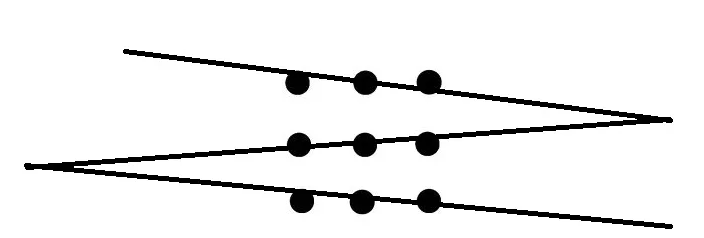 La única forma de hallar la solución es saliéndose de este planteamiento previo y reorganizarlo, salir de la percepción del cuadrado con los puntos y ampliar el campo de trabajo, así fácilmente podríamos llegar a esta solución: