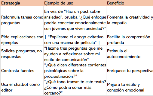 La clave está en pasar de un uso instrumental a un uso dialógico. No se trata solo de pedirle al chatbot que haga cosas por ti, sino de invitarlo a pensar contigo. Aquí te comparto algunas estrategias prácticas para lograrlo: