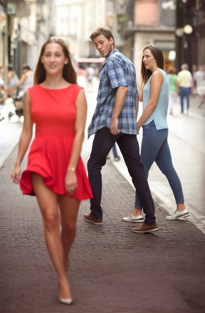 Su éxito global (analizado en papers académicos como “Distracted Boyfriend” Meme Analysis with Rappaport’s Theories) radica en que esta estructura triangular es aplicable a cualquier conflicto humano: desde «Yo / Procrastinación / Trabajo» hasta «Capitalismo / Beneficios a corto plazo / Cambio Climático». La imagen se convierte en un contenedor vacío listo para ser llenado con cualquier ansiedad cultural.